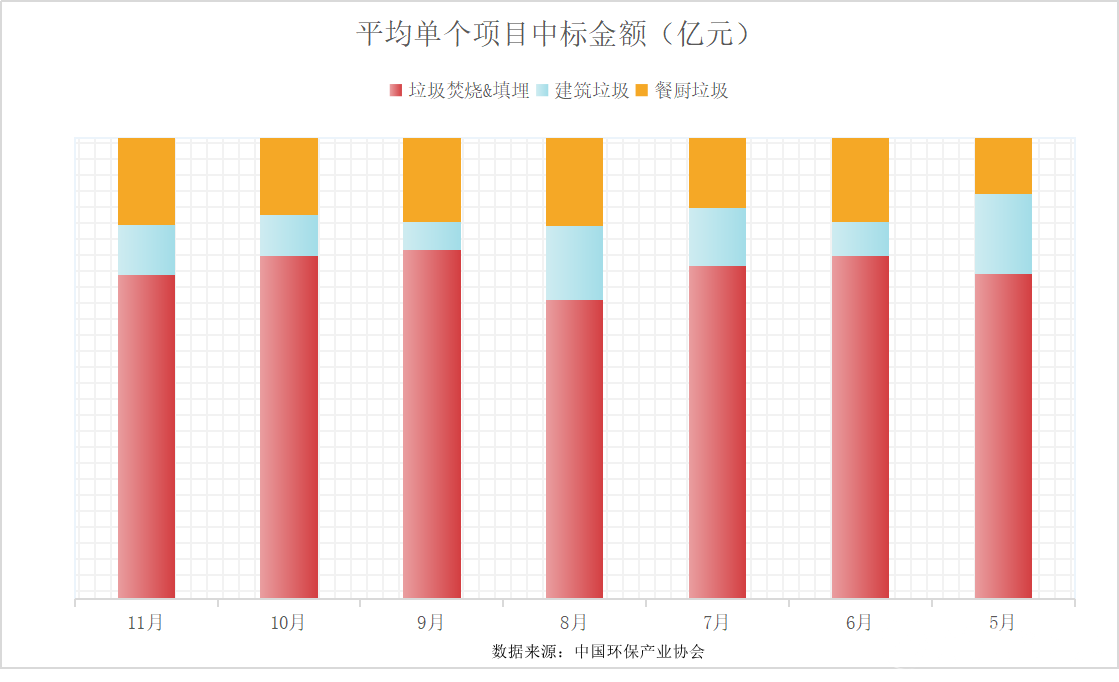 2020年前11个月,全国垃圾焚烧中标项目共计311项,总投资金额共计655.15亿元;餐厨垃圾处理处置中标项目共计361项,总投资金额194.6亿元;2020年5月到11月,全国建筑垃圾处理处置中标项目共计213项,总投资金额61.85亿元。