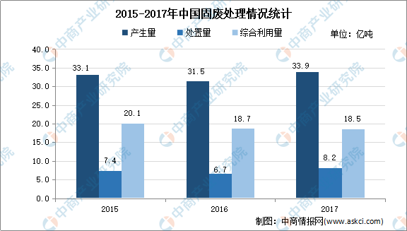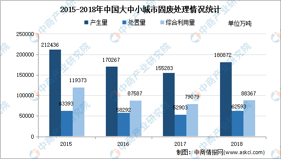 由于社会化进程的加快,2014-2018年我国固体废物处置率不断增长。固废在原有存量没有得到处置和综合利用的情况下,新的增量还在不断的增加,使固废处理面临的问题逐渐加重。2018年,我国大、中城市固体废物产生量达18.1亿吨,处置量6.3亿吨,综合利用量8.8亿吨,较2017年分别增长16.48%、18.32%、11.75%,利用处置占比有待提高。